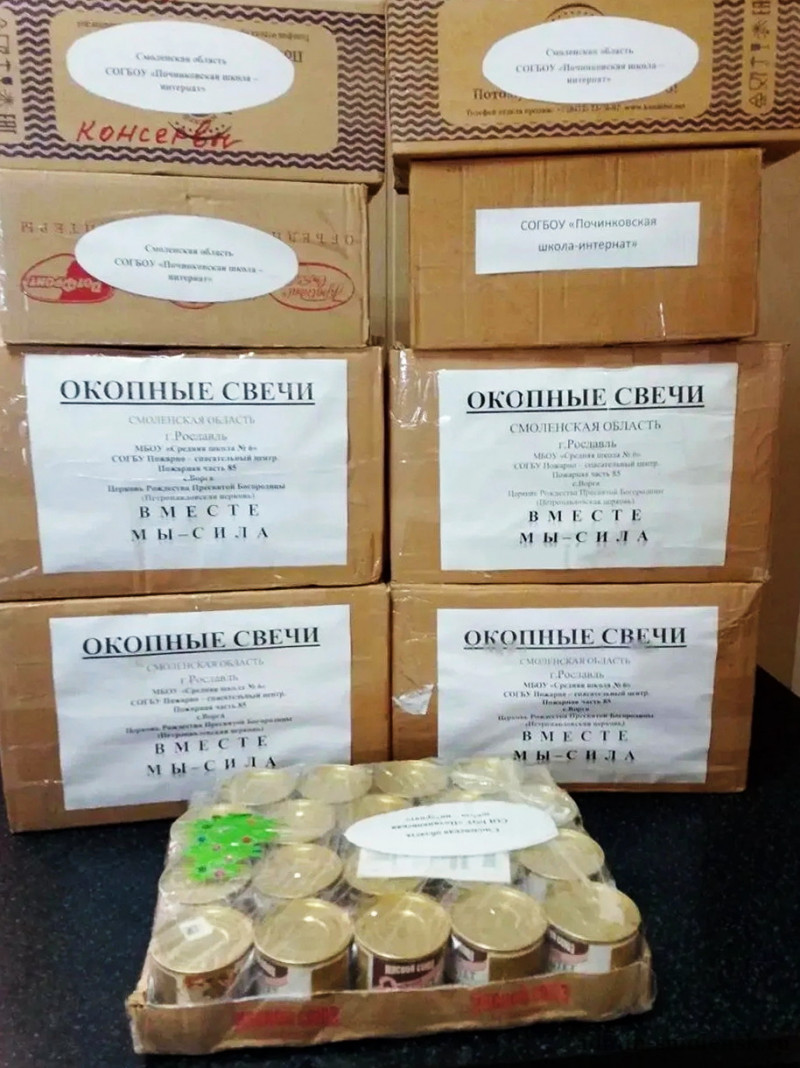 Продукты первой необходимости доставлены волонтёрами Смоленской области в район проведения специальной операции. Среди отправителей благотворительной помощи значатся СОГБОУ "Починковская школа-интернат", средняя школа №6 города Рославля, пожарная часть села Ворга и Петропавловская церковь.